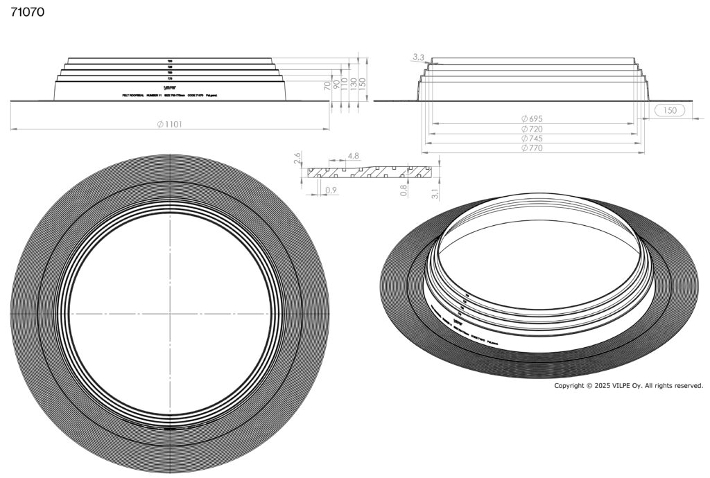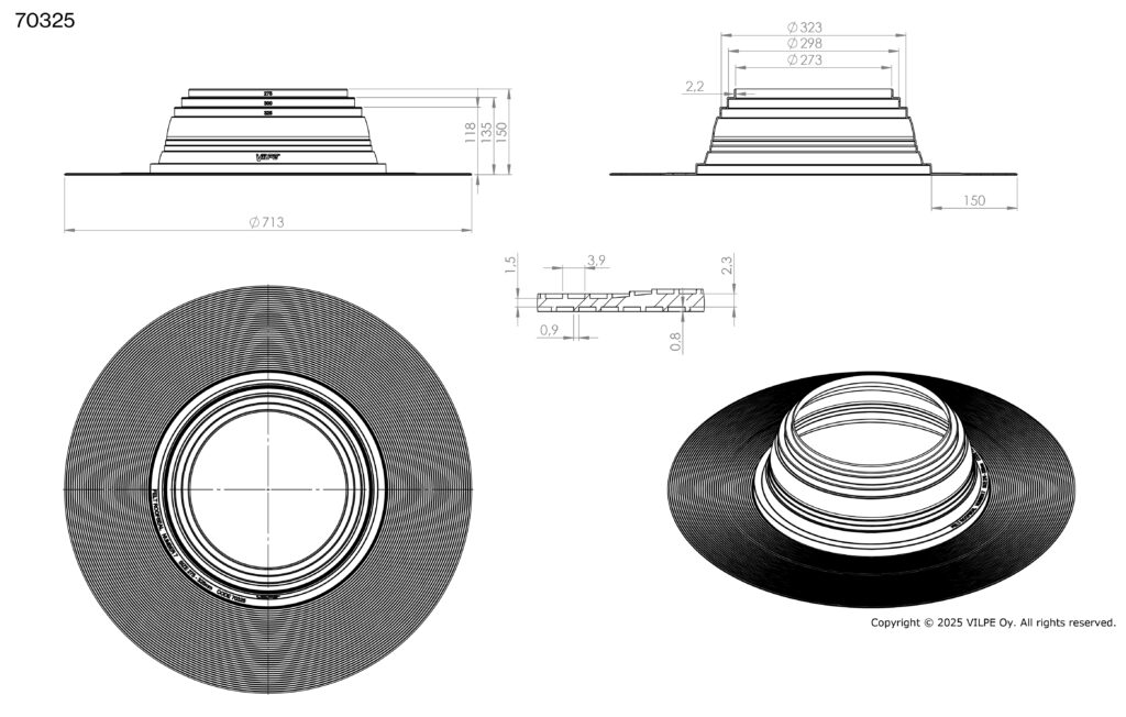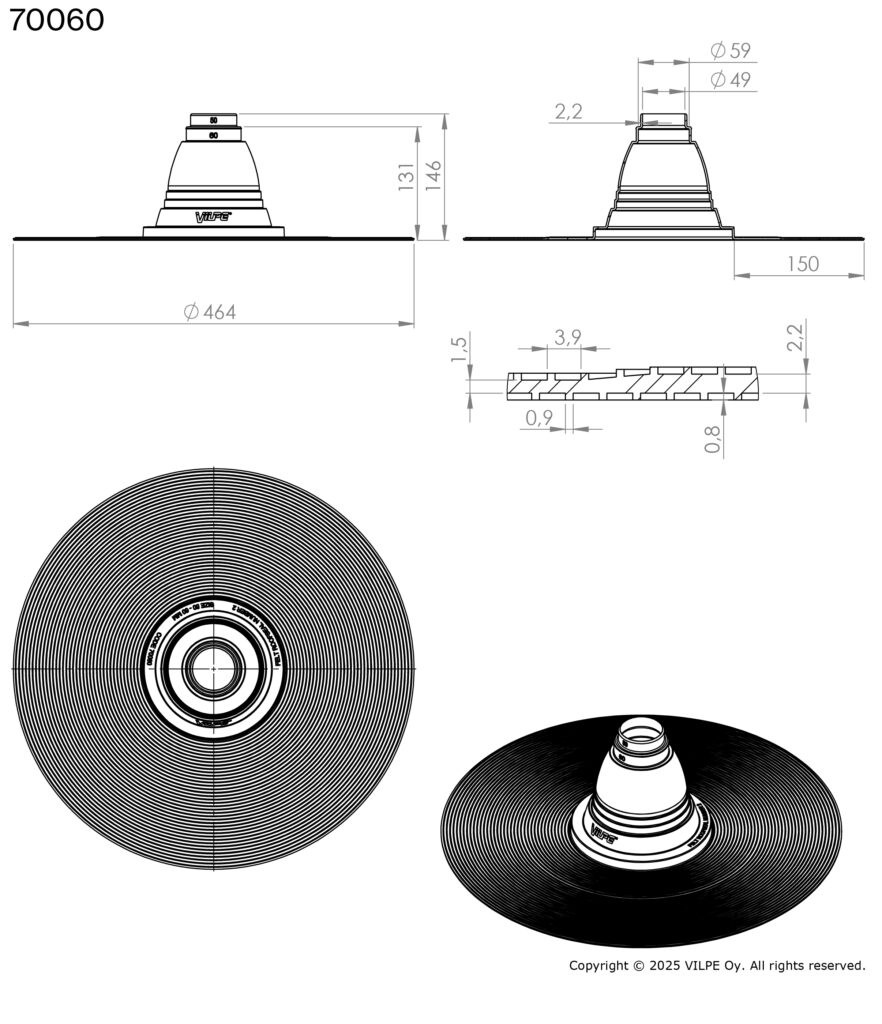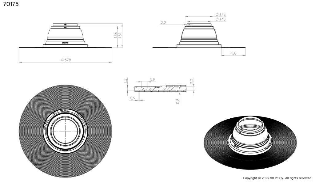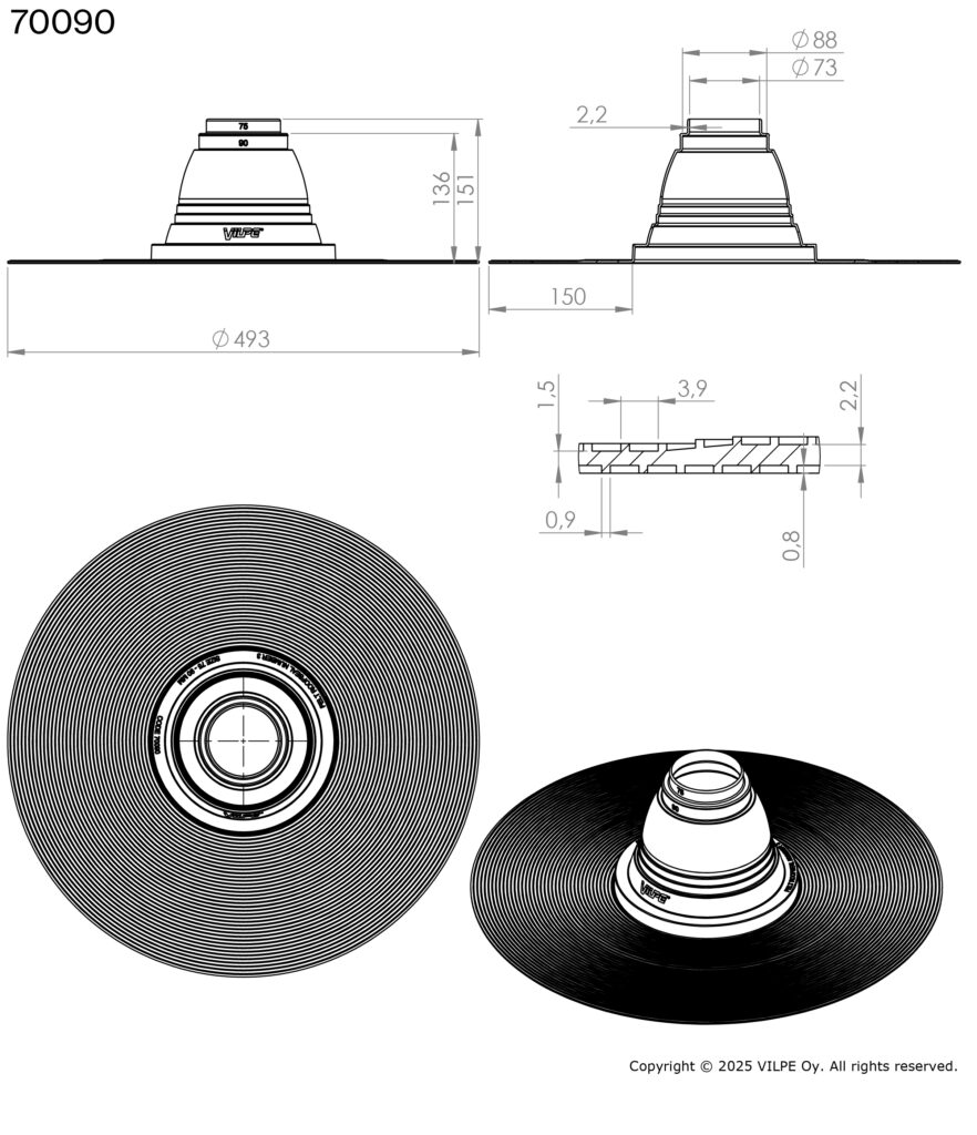 Pielietojums: Blīvslēgs apaļām caurulēm bitumena jumtiem. Izgatavots no EPDM gumijas. Darba temperatūra -30…+90°C. Atloks jāuzstāda ar karstu bitumenu starp divām materiāla kārtām.