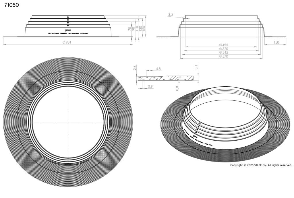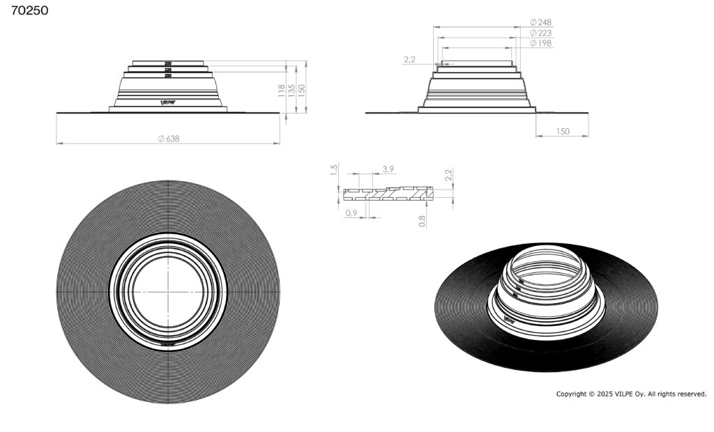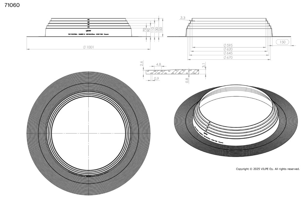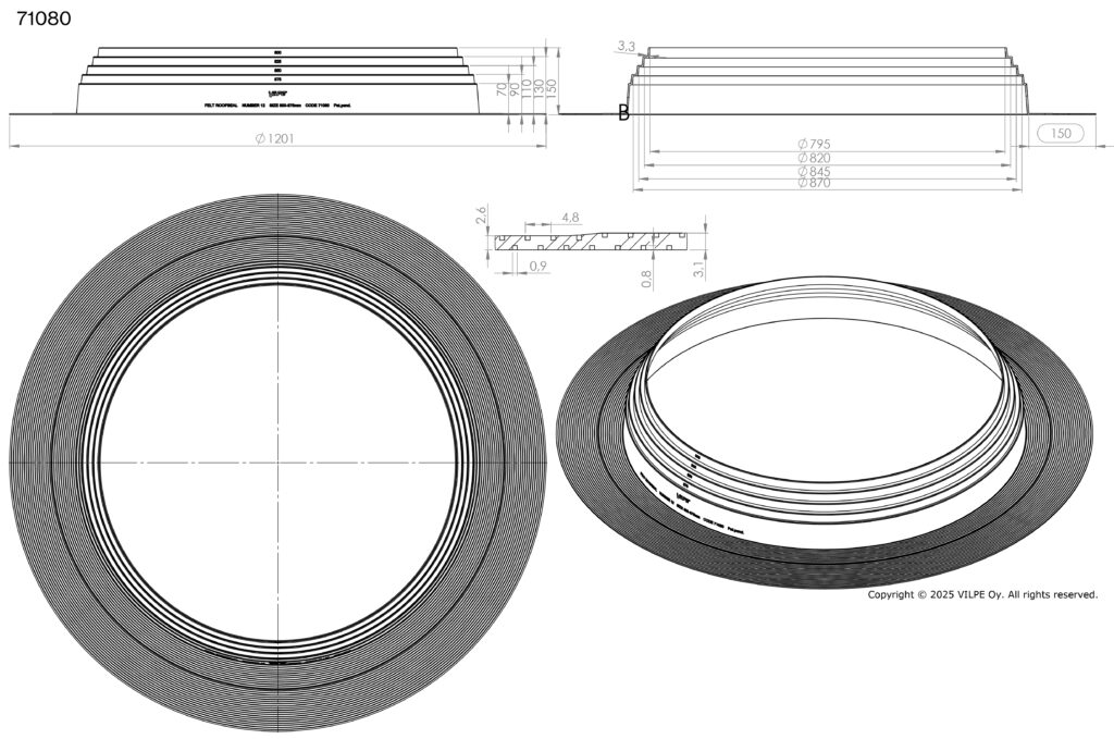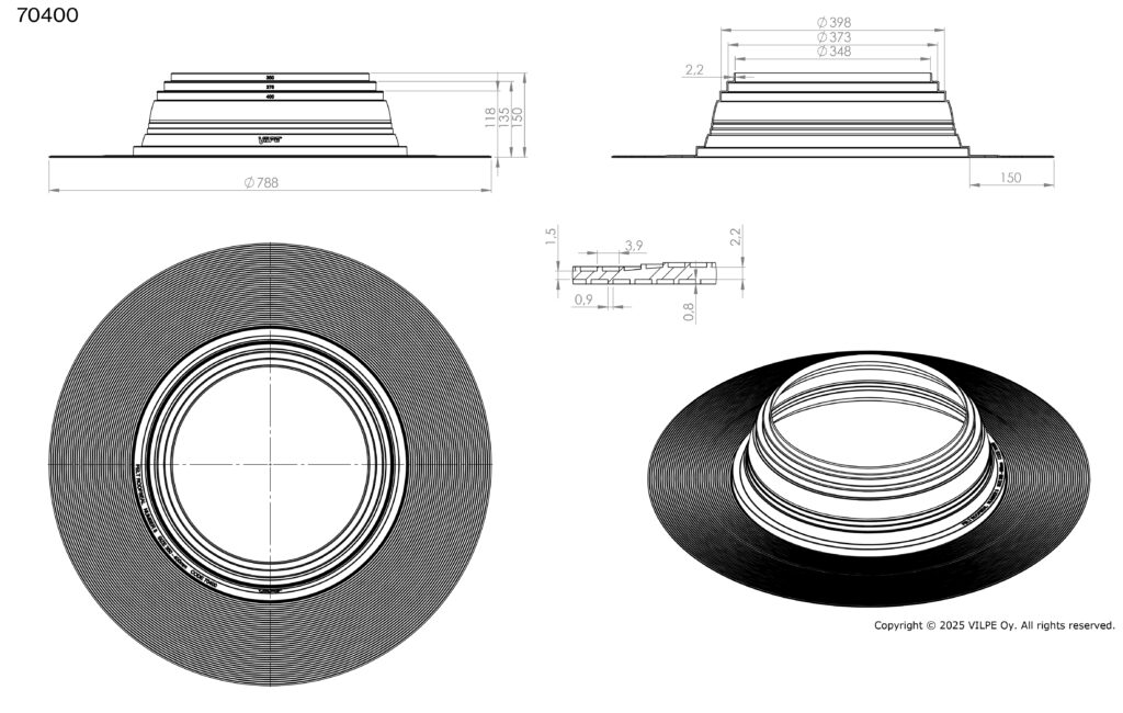 Pielietojums: Blīvslēgs apaļām caurulēm bitumena jumtiem. Izgatavots no EPDM gumijas. Darba temperatūra -30…+90°C. Atloks jāuzstāda ar karstu bitumenu starp divām materiāla kārtām.