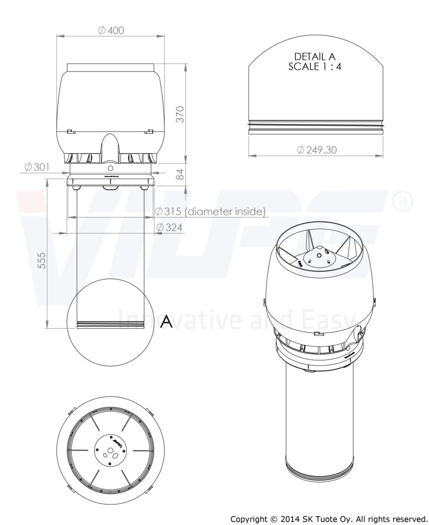 Description: Insulated exhaust ventilation XL pipe with a cowl. Inner pipe is made of galvanized steel and has a lip seal. Installed in a sheet metal cone with opening Ø 315 mm, made by a sheet metal worker.