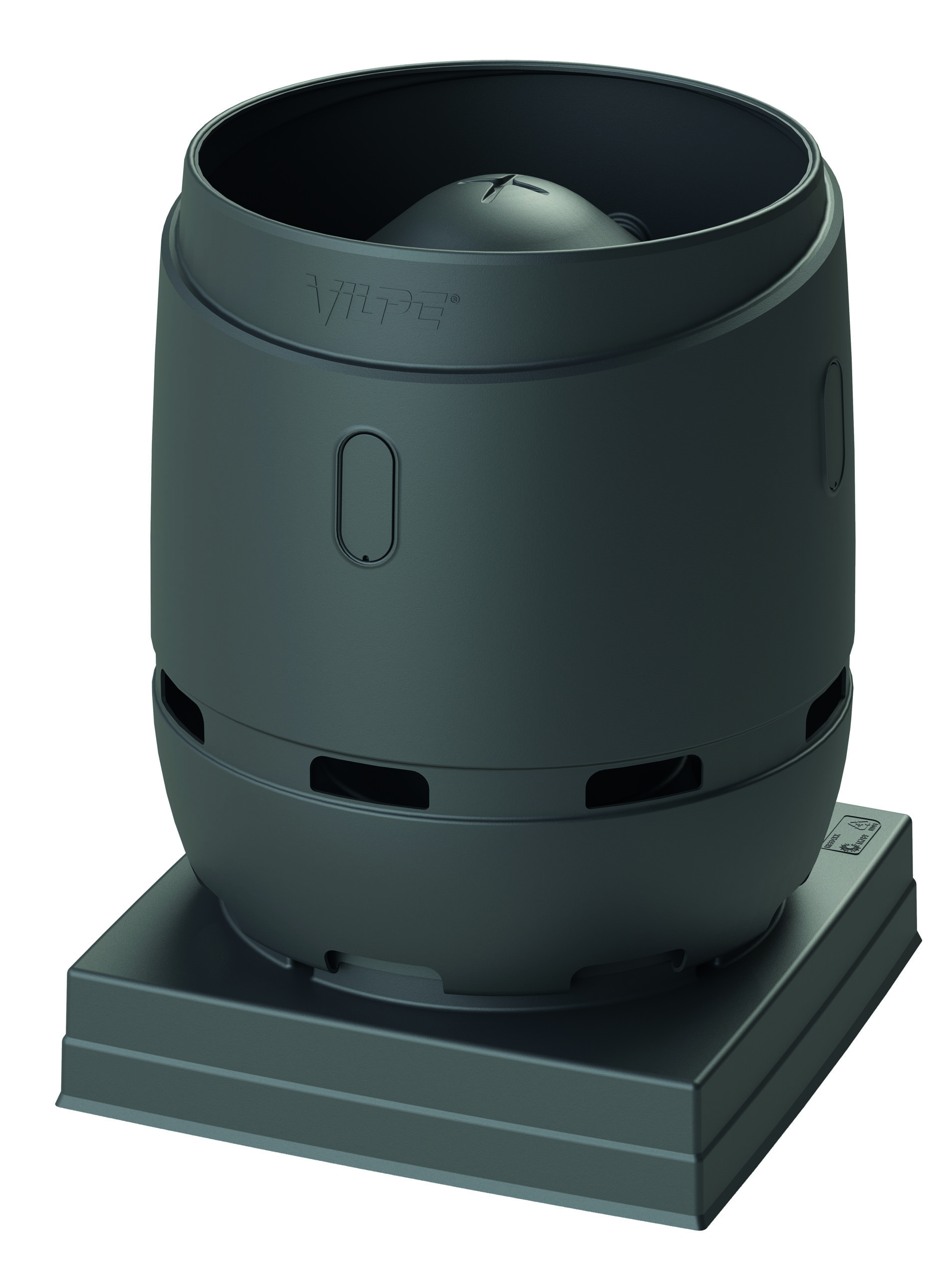 Description: Exhaust vent with FLOW cowl. Installed on a square-shaped 724 x 724 mm pass-through. An assembled square-shaped VILPE pass-through with a silencer is also available.