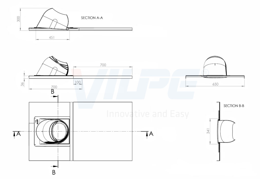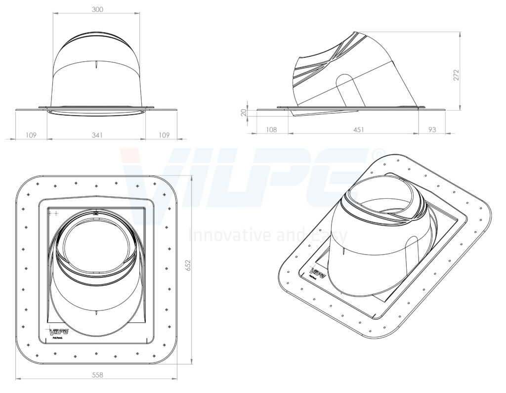 Description: Designed for passing prefabricated round, metal, insulated chimneys with an outer diameter of 200-265 mm through a roof. Installed on roofs with pitches Ø 200 8-50°, Ø 265 8-40°. A rubber gasket and a fastener are provided for attachment to the plastic Chimney Pass-Through plate. VILPE Chimney Pass-Throughs have been tested for fire safety and certified by the Eurofins Expert Services.