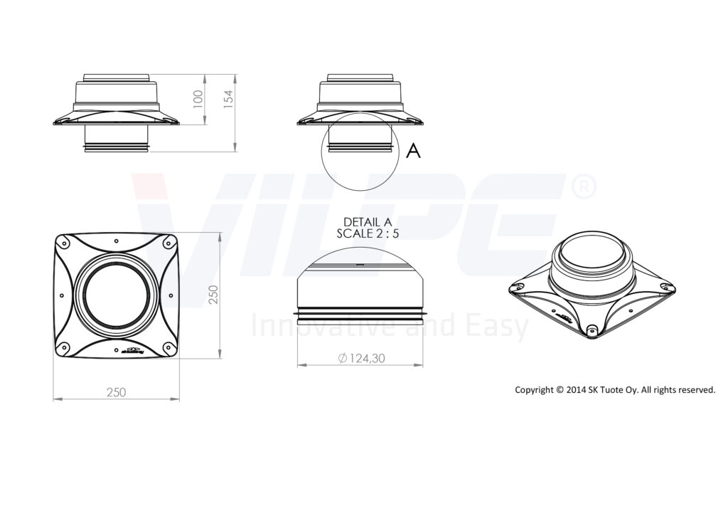 Dimensions: Duct size Ø 125 mm; installation set 250 x 250 mm, installation area must be at least the same size.