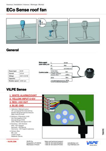 Description: VILPE ECo Sense Roof Fan is installed on a roof’s negative pressure ventilation pipe. The roof fan should be connected to a VILPE Sense Basic Kit Mob. and a VILPE Sense Mobile Base Station. The roof fan adjusts automatically, which allows for demand-controlled ventilation. Control voltage 0-10 V. EC motor.