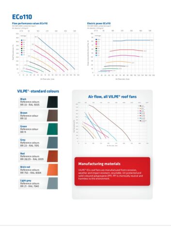 Description: Energy-efficient insulated roof fan with a DC motor for the top of an air conduit or silencer, controlled with a 0–10 V voltage. An installation set for installation on a flat surface is included. VILPE ECo Controller is available separately.
