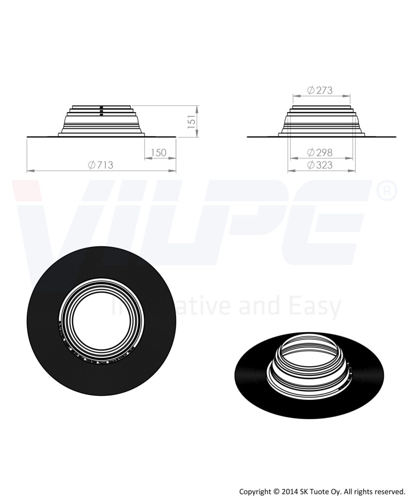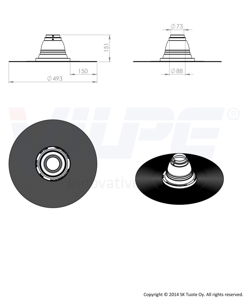 Description: Pass-through seal for round pipes installed on a felt roof. The weather- and ozone-resistant properties of EPDM rubber are the best possible, and it can endure continuous heat stress of +90°C (and intermittently up to +150°C). EPDM rubber also tolerates the acids and alkalis often found in the air in industrial areas. Should be installed with hot bitumen between two felt layers. A separately available Clamp should also purchased, and selected based on the size of the pipe. Pass-through seals are recommended to use on flat roofs (max. 11,5° slope)