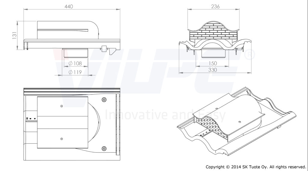 Description: Can be used for the ventilation of roof structures and attic spaces, as well as sewer pipes. Designed to replace one concrete roof tile with a width of 330 mm, and a wave width and height of 330 mm and 27-40 mm respectively.
