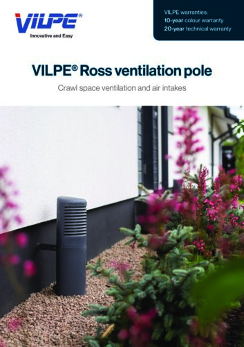 Description: For ventilating the crawl space of a house, thus preventing moisture damage and radon problems in ground floors. Can also be used as an inlet air pipe. The pole is designed to let air flow through it with practically no obstruction, preventing the creation of an air lock. The structure also prevents snow, trash and small animals from entering the space in the base floor. The Ross-160 can be connected to a 160 mm ventilation duct, and requires an approx. 208 mm opening for installation.