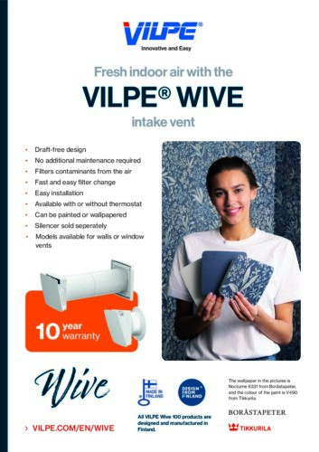 Description: Silencer for the VILPE Wive intake vent. Dampens outdoor noise which might otherwise enter the room through the intake vent. The silencer must be installed with the shiny side facing inward. Dimensions: Ø 90 mm.