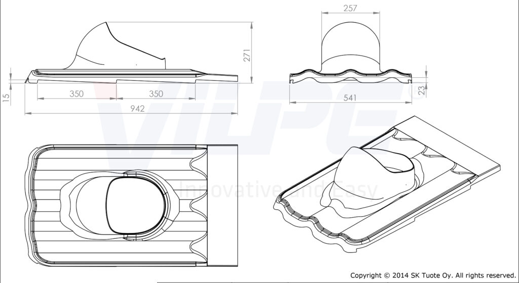 Description: For profiled steel roofs (with tiles which have a wave distance of 183.3 mm, wave length of 350 mm and wave height of 39 mm–e.g. Ruukki Monterrey). The seal on the bottom of the pass-through guarantees a fully waterproof end result, and is attached to the bottom of the flange. Installing the VILPE XL Universal MK1 Pass-Through is simple and easy: the kit includes all installation materials and clear instructions. The pass-through enables the installation of VILPE roof fans, exhaust pipes, ventilation pipes and antenna pass-throughs onto the roof. Designed for Ø 160-250 mm pipes.
