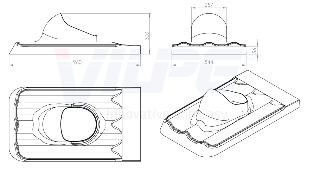 Description: For all profiled steel and tile roofs. The seal on the bottom of the pass-through guarantees a fully waterproof end result, and is attached to the bottom of the flange. Installing the VILPE XL Universal Pass-Through is simple and easy: the kit includes all installation materials and clear instructions. The pass-through enables the installation of VILPE roof fans, exhaust pipes, ventilation pipes and antenna pass-throughs onto the roof. Designed for Ø 160-250 mm pipes.