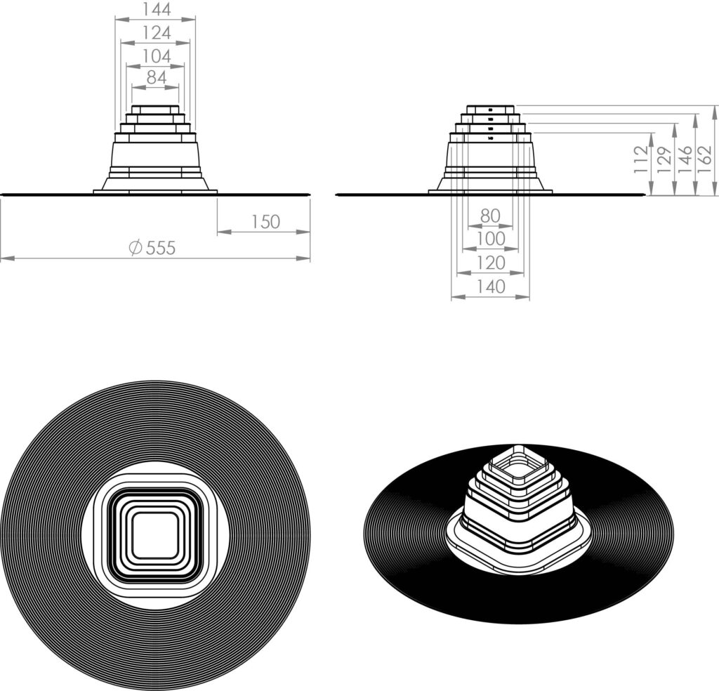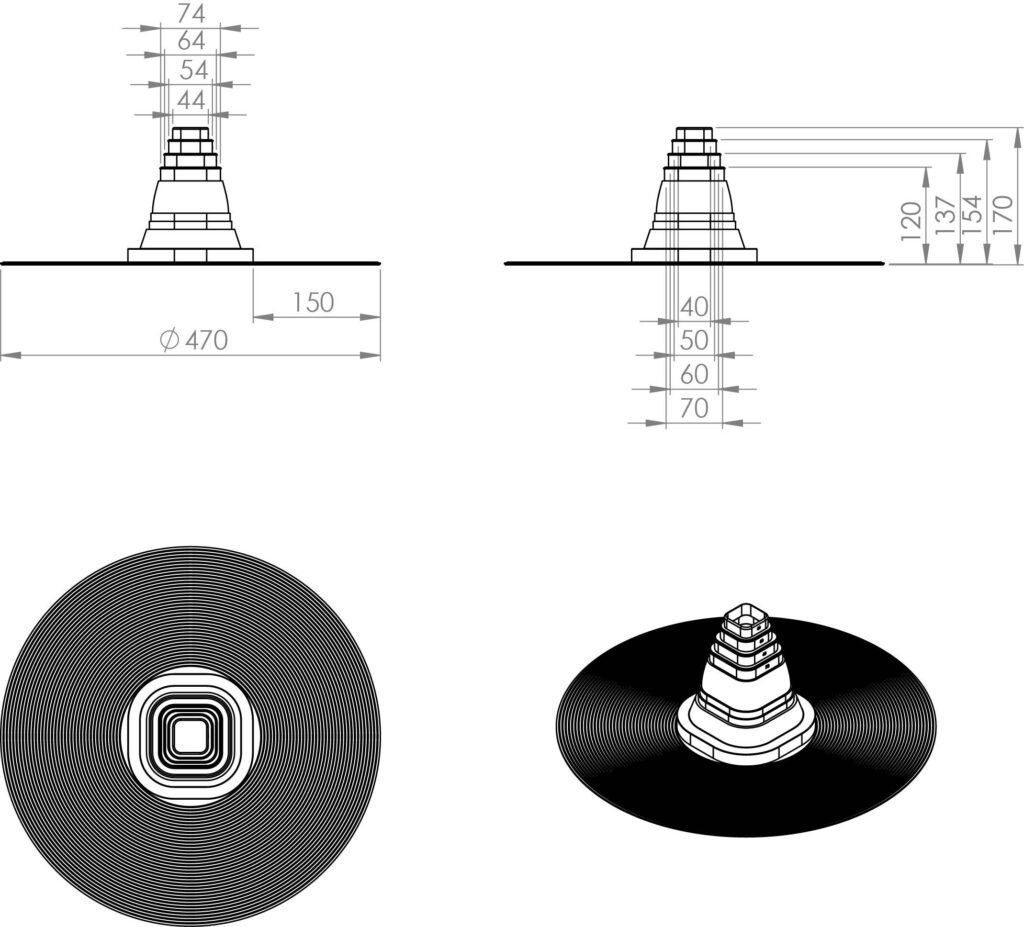 Kirjeldus: Nelikant torude läbiviigutihend bituumenkatusele. EPDM-kumm tagab suurepärase ilmastiku- ja osoonikindluse ning talub pidevat kuumust kuni +90°C (ajutiselt kuni +150°C). Tihend paigaldatakse kuuma bituumeni abil kahe katusekihi vahele. Vajaliku suurusega torule tuleb eraldi juurde osta RHS klamber RST A2. Läbiviigutihendid sobivad kasutamiseks lamekatustel (< 6° kalle). Sisaldab: Tihend.