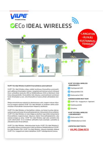 Tuotekuvaus: VILPE ECo Ideal Wireless -järjestelmään tarkoitettu CO₂-anturi ja seinäohjain (230 VAC). Mittaa sisäilman CO₂-tason ja lähettää tiedon langattomasti ohjausyksikölle, joka säätää ilmanvaihtotehoa mittausten perusteella. Painikkeella voidaan valita toimintatila tai tehostus, ja LED-merkkivalot näyttävät tason ja laitteen tilan.