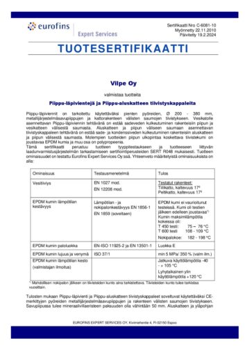Sisältö: Läpivienti, kumitiiviste ja kiristin, pellityssarja, tiiviste ja asennusohje.