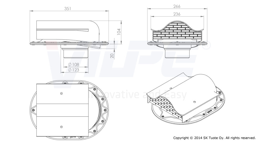 Komplektacija: KTV ventiliacinė čerpė be adapterio, hidroizoliacinis žiedas, hermetikas, sraigtai, montavimo instrukcija, šablonas.