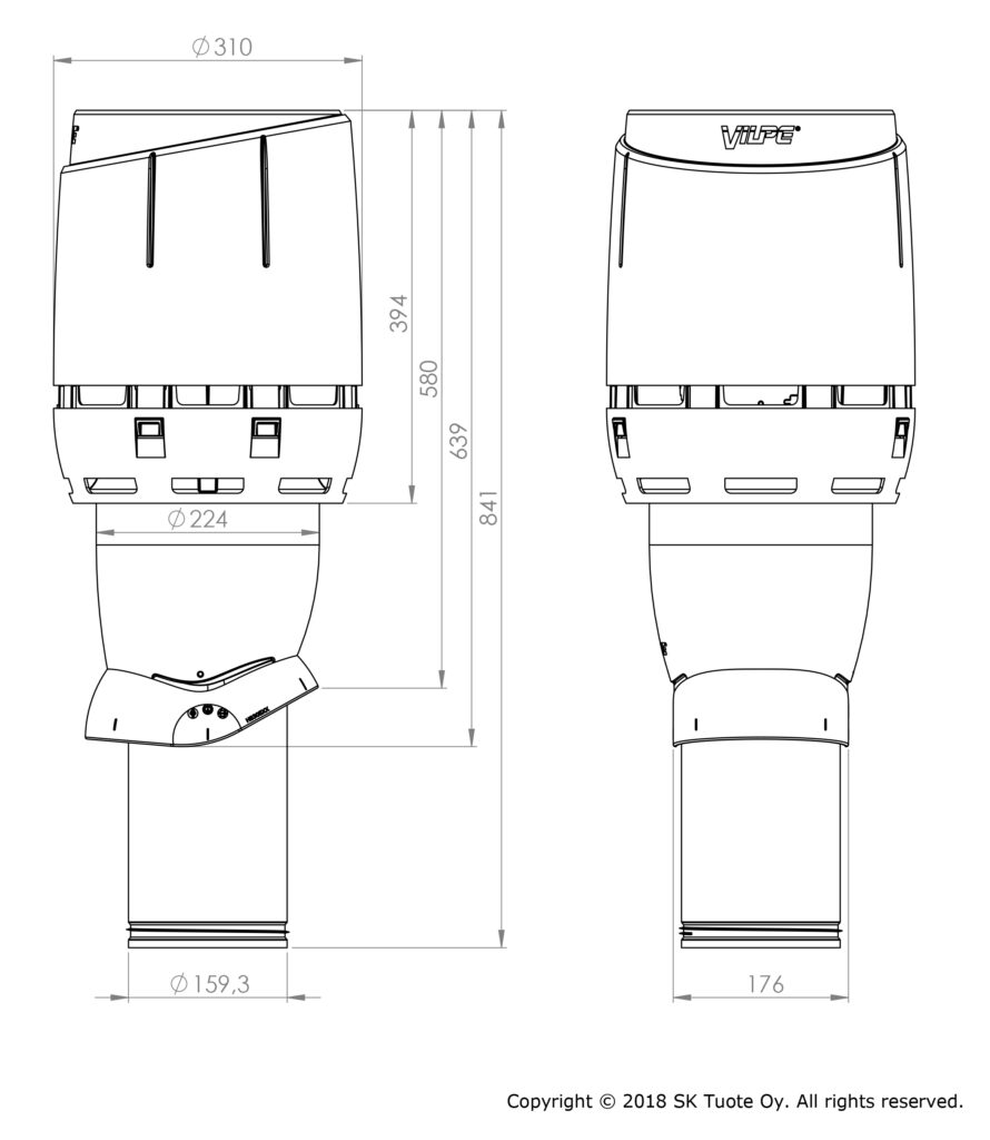 Izmēri: Caurules diametrs Ø 160 mm, ārējais diametrs Ø 225 mm, augstums virs jumta aptuveni 500 mm.
