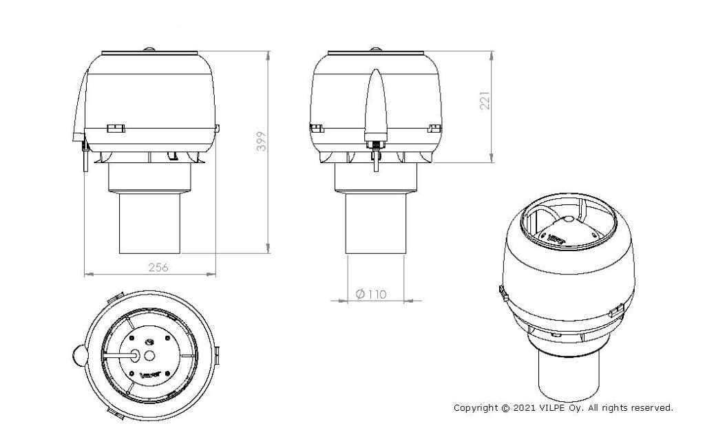 Izmēri: Kanāla izmērs Ø 110 mm, ārējais Ø 257 mm. Augstums virs jumta 670 mm, uzstādot uz jumta deflektora