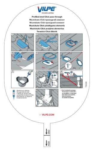 Komplektā: Pieslēguma elements, Click hidroizolācijas gredzens, skrūves, uzstādīšanas instrukcija un šablons.