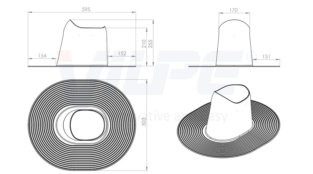 Zastosowanie: Przejście dachowe stosowane dla dachów bitumicznych. Montuje się je pomiędzy dwie warstwy pokrycia dachu. Dla dachów o spadku mniejszym niż 20%.