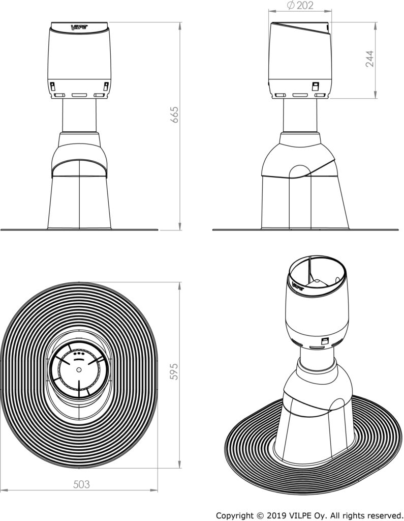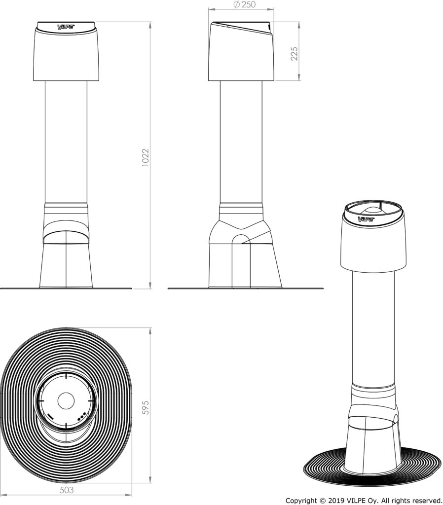 Contents: Tall felt pass-through, negative pressure air vent pipe, VILPE FLOW cowl, screws.