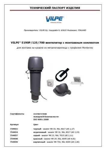 Для монтажа на кровлю из металлочерепицы с профилем Monterrey. VILPE E190P/125/700 вентилятор используется для вентиляции внутренних помещений дома, гаражей и для подключения к кухонной вытяжки и устанавливается на кровлю из металлочерепицы с профилем Monterrey (ширина волны ≈ 183,3 мм, длина профиля min 350 мм, высота профиля ≈ 39 мм). Комплект: вентилятор, регулятор, проходной элемент Muotokate, кольцо гидрозатвора, герметик, наборы крепежа, монтажные инструкции