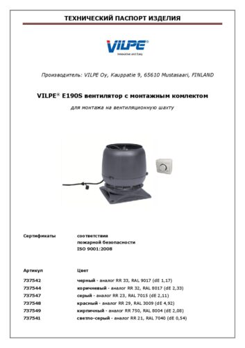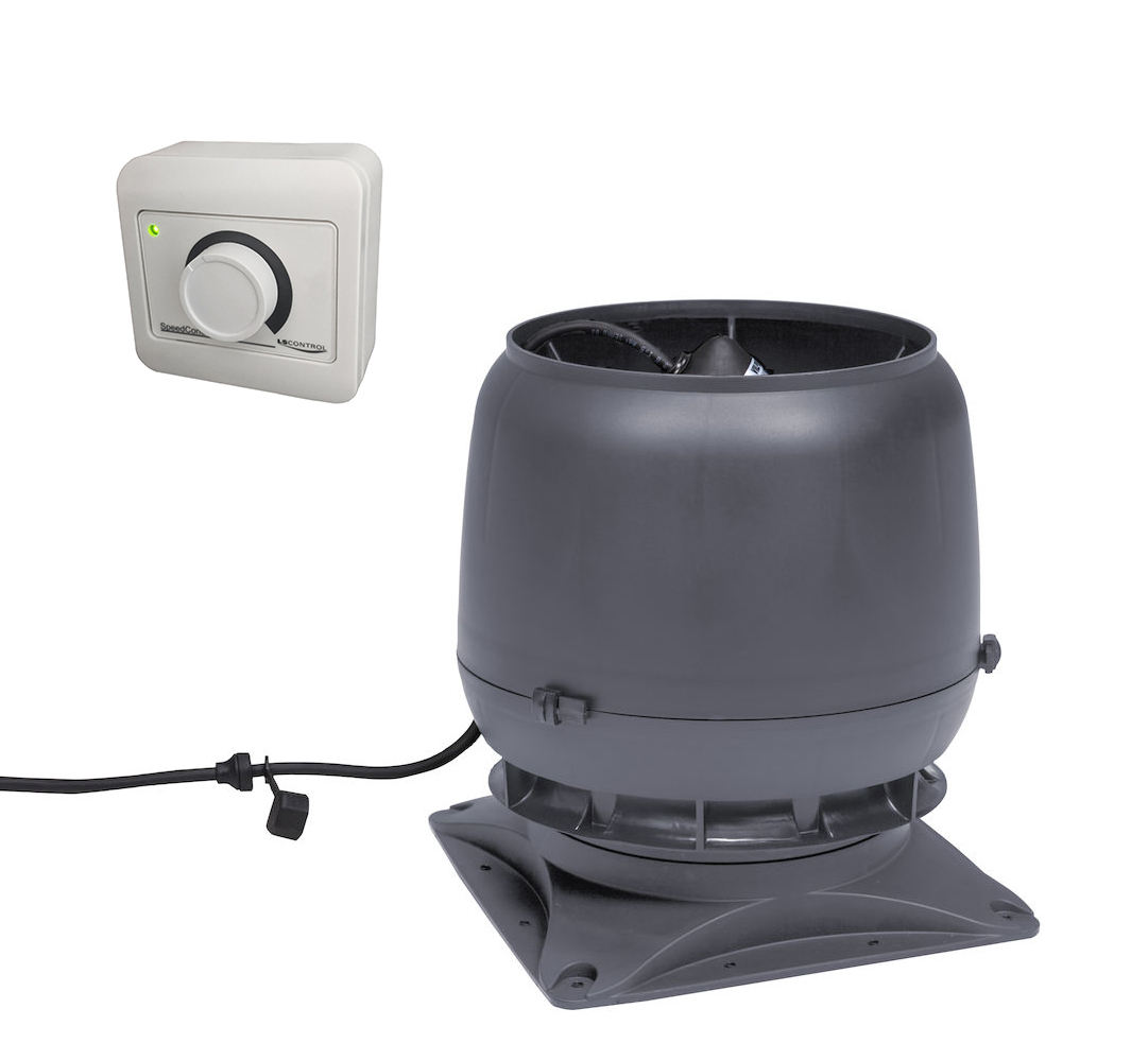 Комплект: E190S вентилятор, регулятор, основание 300 х 300 мм с соединительным патрубком, 2 монтажные инструкции и 2 набора крепежа.