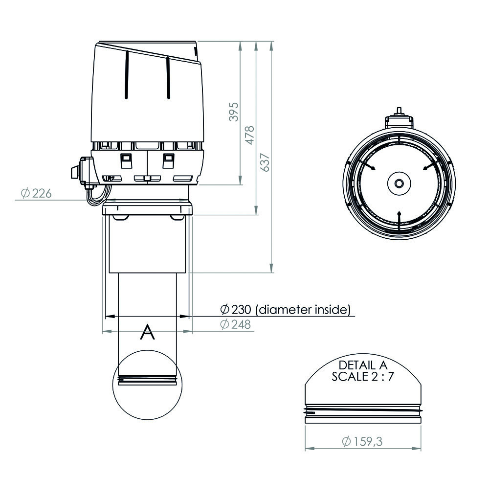 Энергоэффективный вентилятор постоянного тока c колпаком Flow. Тип двигателя EC. Сервисный выключатель для проведения тех. обслуживания на колпаке вентилятора. Регулятор скорости вращения 0-10 V приобретается отдельно. Внутренняя труба из оцинкованной стали с манжетным уплотнением. Устанавливается в изготовленный жестянщиком конус с посадочным диаметром Ø 230 мм.