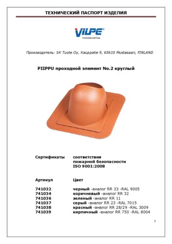 Проходные элементы VILPE PIIPPU для дымоходов прошли испытания на пожаробезопасность и сертифицированы Eurofins Expert Services. Проходные элементы дымохода должны устанавливаться на кровлю в соответствии с инструкцией по монтажу VILPE. Другие технические детали, такие как безопасное расстояние до горючего материала, предоставляются продавцом дымохода.