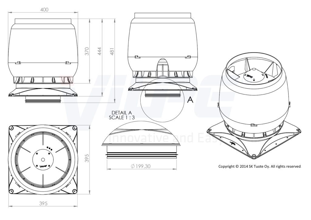 Dimensioner: Kanalstorlek Ø 200 mm, den fyrkantiga monteringsplattan 400 x 400 mm.