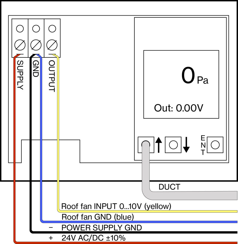 VILPE Differenstryckregulator 24 V mäter noggrant lufttrycket i ventilationskanalen. När regulatorn upptäcker en tryckförändring, justerar den automatiskt takfläktens varvtal för att säkerställa ett konstant tryck i kanalen.