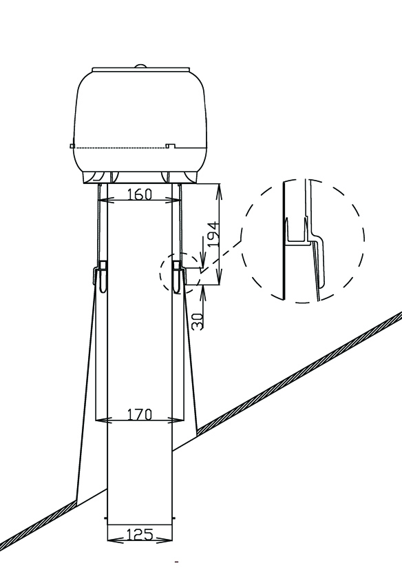 Användning: Uppåtblåsande isolerad takfläkt. Inre rör av förzinkad tunnplåt. Maxflöde 120 l/s. Installeras på en, av plåtslagare eller annan tillverkad plåtkon med övre öppningsmått 170 mm.