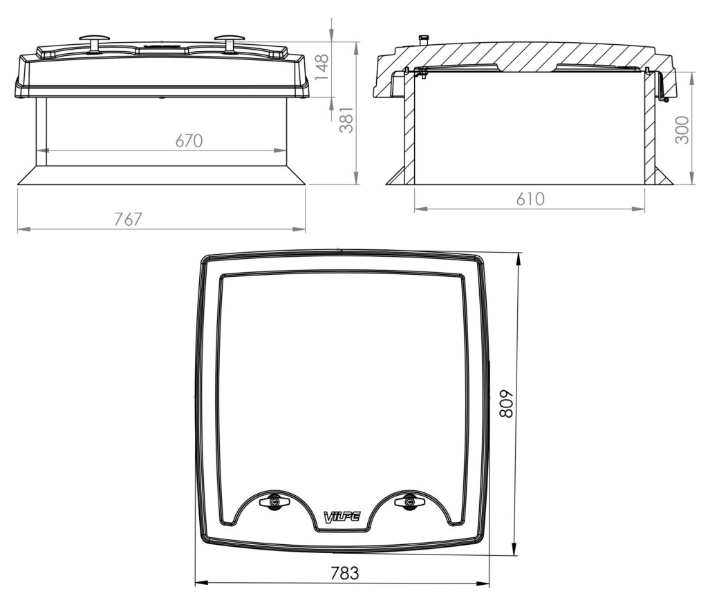 Dimensioner: Öppningsmått 610x610mm. Ramens höjd 300 mm.