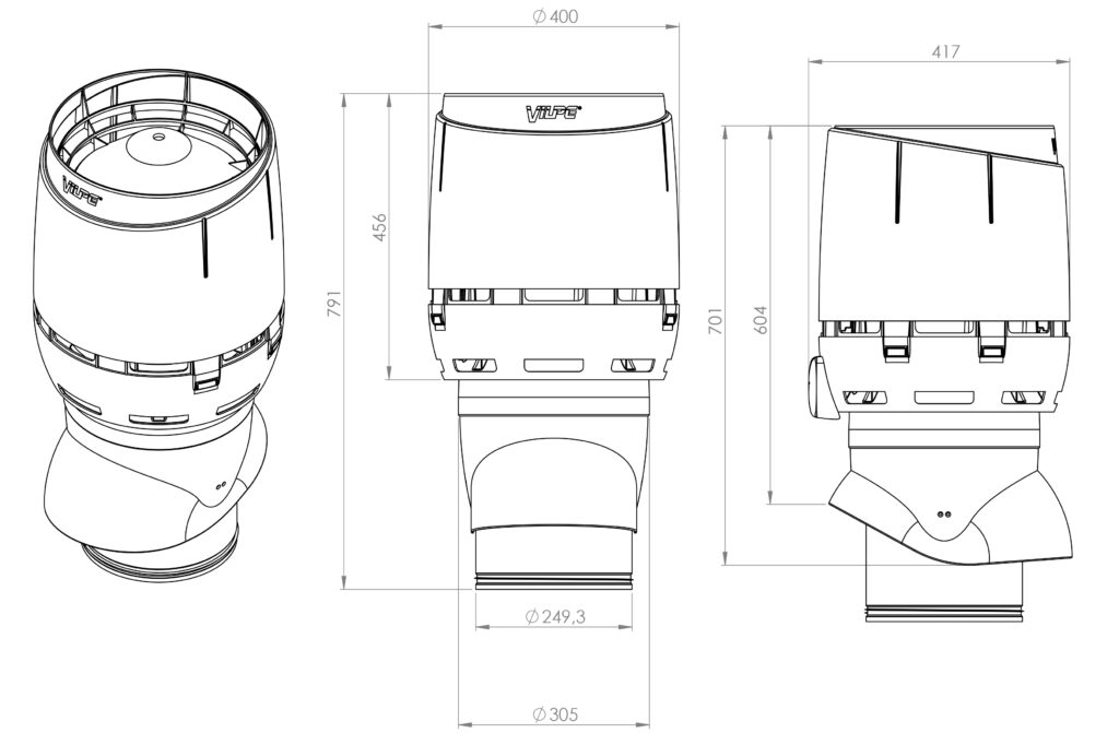 Om objektet kräver att hela ventilationskanalen måste vara isolerad, rekommenderar vi VILPE 250S 400X400 frånluftshuv med en rörskarv. Det monteras på en genomföring som en plåtslagare har gjort.