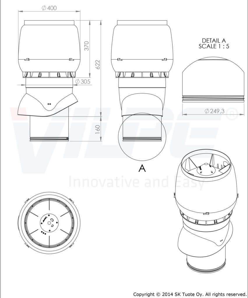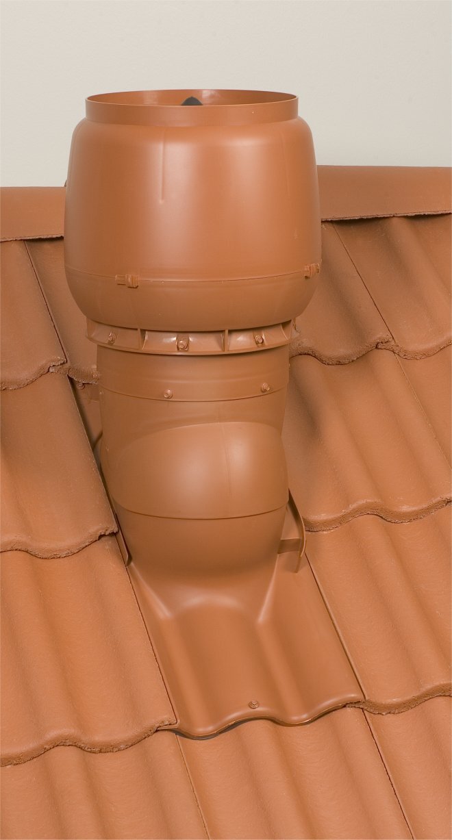 Användning: Den isolerade XL-frånluftshuven med hatt riktar luftflödet uppåt och regnvatten hindras att rinna ner i röret. Inre rör är av förzinkad tunnplåt. Används till avluft från ventilationsaggregat eller köksfläkt. Med huven behövs VILPE XL-genomföring enligt takmaterial.