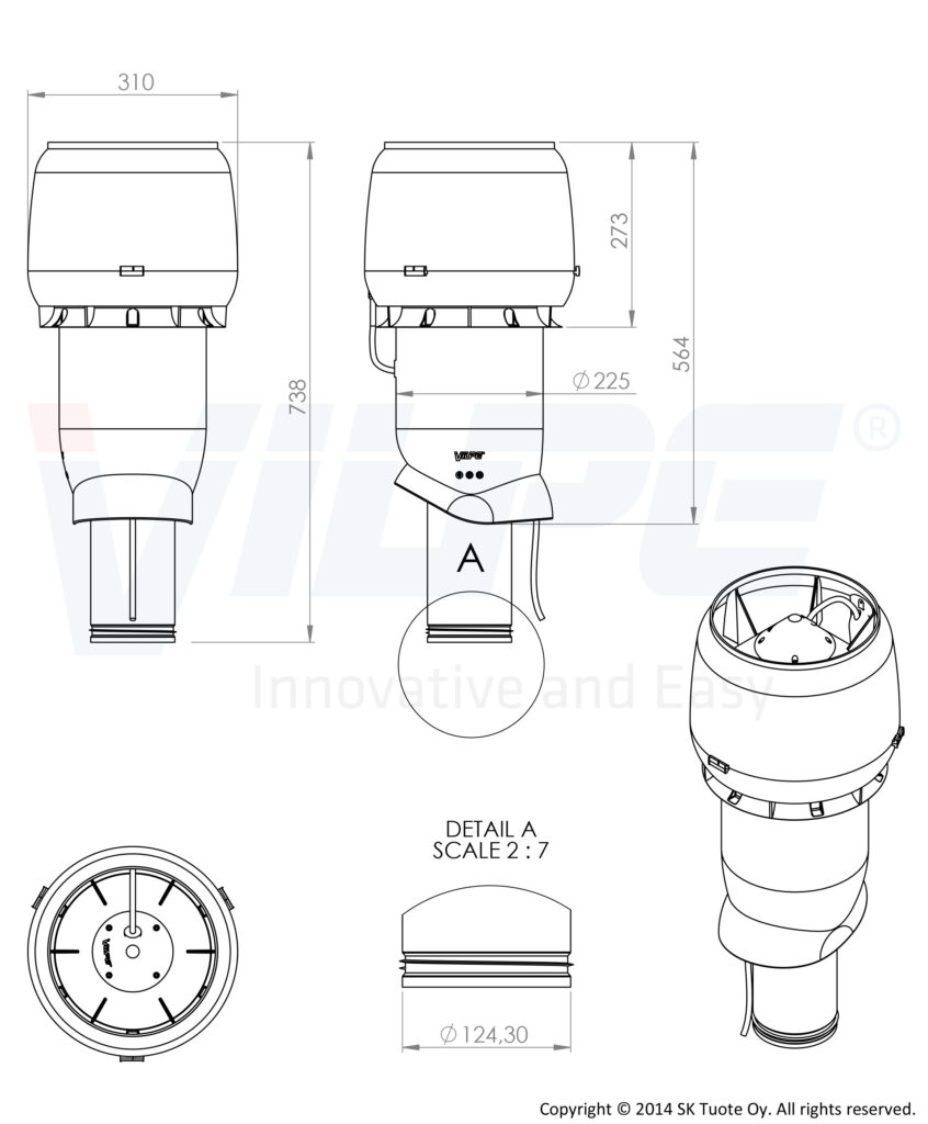 Användning: Uppåtblåsande isolerad takfläkt. Inre rör av perforerad förzinkad tunnplåt. Med fläkten behövs VILPE genomföring enligt takmaterial. Maxflöde 155 l/s.