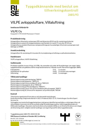 Användning: Oisolerad avloppsluftare med FLOW-hatt. Max rek taklutning 45°.